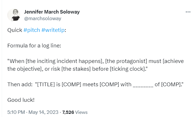 To begin with, let’s talk about the traditional pitch. There is a standard formula for pitches or loglines that you may see recommended on Twitter and elsewhere. Literary Agent Jennifer March Soloway has shared a useable template on Twitter: