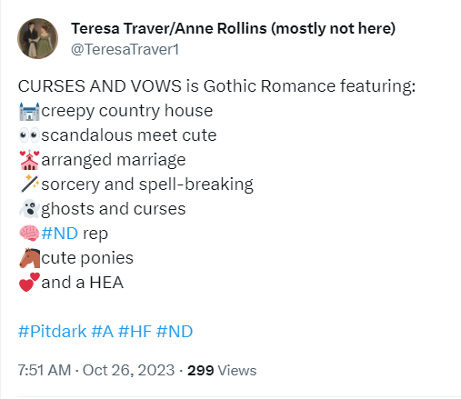 I’ve gotten hearts from pitches like that. But I’ve also had success with very nontraditional pitch formats, like this alternative pitch for CURSES AND VOWS that drew likes at past pitch parties: